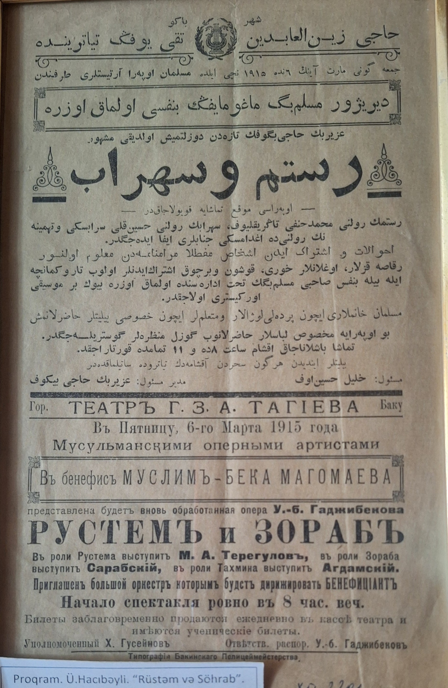 The first information about the opera "Rustam and Sohrab" was published in 1910 in an issue of the "Gunash" newspaper.