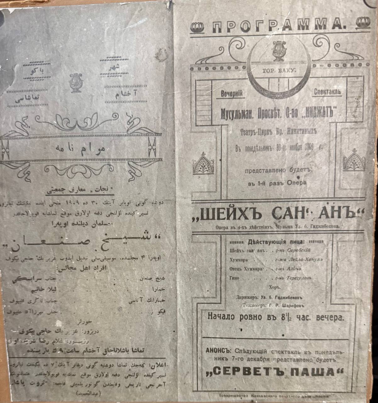 Publications in the press of that time (“Seda”, “Teraggi”, “Hagigat”, “Kaspi”, “Baku”, etc.) partially explained the reasons for the failure. Mehdi bey Hajinski, who first introduced Russian-speaking readers to the legend of “Sheikh Sanan” in 1907, published an article under the pseudonym “Avara” after watching the opera, in which he wrote: “The opera ‘Leyli and Majnun’ gave the young composer the opportunity to create a new opera ‘Sheikh Sanan’. Preserving the main idea of the legend – ‘love knows no boundaries’, the young composer wrote beautiful music for it” (“Kaspi”, December 2, 1909, No. 270). In the reviews of arts figures and journalists who attended “Sheikh Sanan”, there were ecstatic assessments: “extraordinarily beautiful melody of the opera” (“Hagigat”, May 26, 1910, No. 118), “very beautiful music” (“Seda”, December 2, 1909, No. 45), “beautiful songs” (newspaper “Reklama”, in Russian), as well as expressions like “composed with magnificent music” (“Seda”, October 25, 1909, No. 15).So why did the staging fate of the opera “Sheikh Sanan” turn out to be unsuccessful?